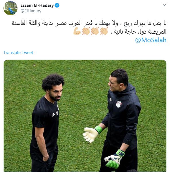 ونشر الحضري صورته مع محمد صلاح عبر موقع التواصل الاجتماعي "تويتر" مغردا:يا جبل ما يهزك ريح، ولا يهمك يا فخر العرب مصر حاجة والقلة الفاسدة المريضة دول حاجة تانية.