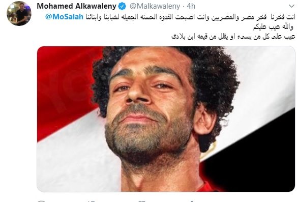 وكتب الكواليني عبر حسابه على تويتر " أنت فخرنا فخر مصر والمصريين وأنت أصبحت القدوه الحسنه الجميله لشبابنا وابنائنا