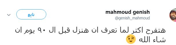 ودون جنش عبر حسابه بموقع التواصل الاجتماعي "تويتر" تغريدة قال فيها،: "هتفرح أكتر لما تعرف إني هنزل قبل الـ ٩٠ يوما إن شاء الله".