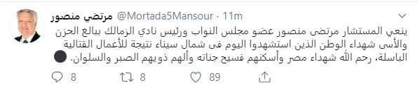 وكتب مرتضى، على صفحته الشخصية عبر موقع التواصل الاجتماعي "تويتر":" أنعي ببالغ الحزن والأسى شهداء الوطن الذين استشهدوا اليوم فى شمال سيناء نتيجة للأعمال القتالية الباسلة، رحم الله شهداء مصر وأسكنهم فسيح جناته وألهم ذويهم الصبر والسلوان"ّ.