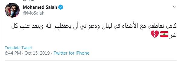 وكتب صلاح عبر حسابه على تويتر " كامل تعاطفي مع الأشقاء في لبنان ودعواتي أن يحفظهم الله ويبعد عنهم كل شر".