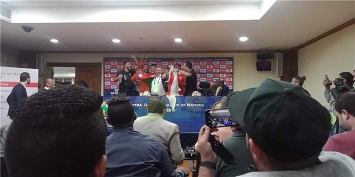 وأثناء حديث شوقي غريب المدير الفني للمنتخب عن المباراة في المؤتمر الصحفي، فوجيء الجميع بدخول عدد من اللاعبين معهم العلم المصري، للاحتفال مع المدير الفني بطريقة رائعة نالت استحسان كل الصحفيين المصريين والأجانب الحاضرين.