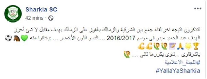 وكتب حساب نادي الشرقية الرسمي قائلا: "تتذكرون نتيجة آخر لقاء جمع الشرقية والزمالك بالفوز على الأبيض بهدف مقابل لا شيء أحرزه عبد الحميد ميدو فى موسم 2016 /2017، البسوا اللون الأخضر، بيخافوا منه، يا شرقاوي، يا ترى كنت بتتفرج على الماتش فين وقتها؟".