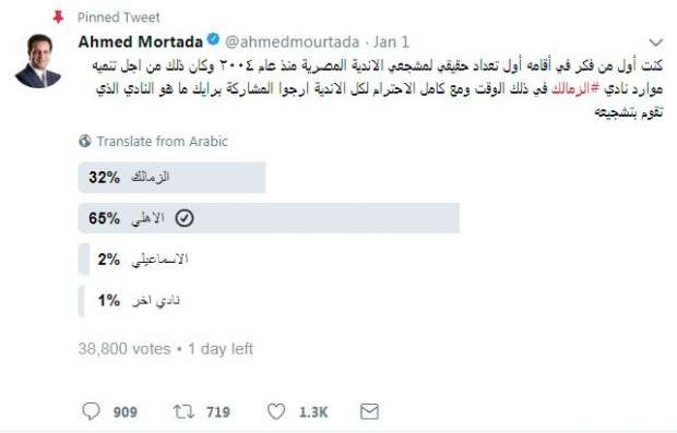 قام أحمد مرتضى، عضو مجلس إدارة نادي الزمالك السابق، استطلاعا جماهيريا عبر حسابه الرسمي على موقع التواصل الإجتماعي «تويتر» لقياس شعبية النادي الأكثر جماهيرية في مصر.