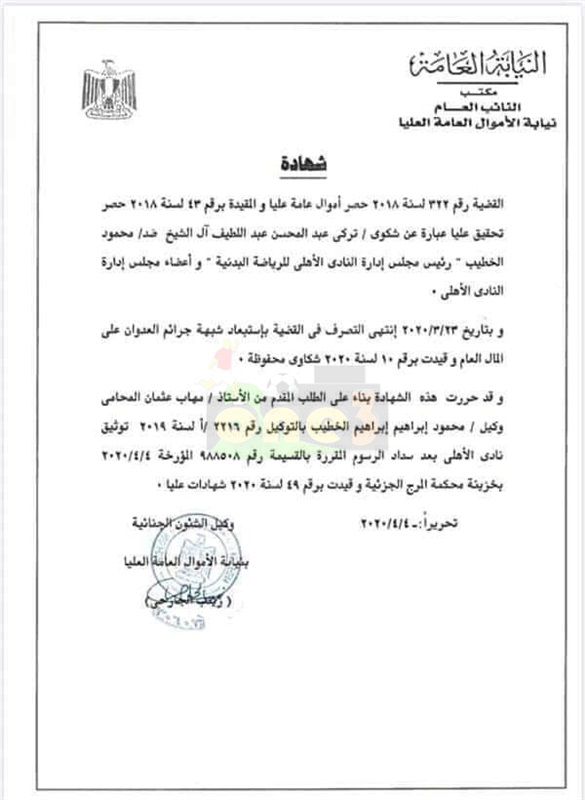 وفي النهاية فجر محمد عثمان مفاجأة من العيار الثقيل، حول وجود شهادة رسمية من مكتب النائب العام، تُثبت براءة النادي الأهلي من العدوان على أموال تركى آل الشيخ وهي كالأتي: "أنه بتاريخ 23 مارس 2020 إنتهى التصرف في القضية بإستبعاد شبهة جرائم العدوان على المال العام وقيدت برقم 10 لسنة 2020 شكاوى محفوظة وذلك بحسب الشكوى المقدمة من تركي عبد المحسن عبد اللطيف آل شيخ ضد محمود الخطيب رئيس مجلس الأهلي".