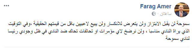 أكد المهندس فرج عامر، رئيس نادي سموحة، عبر حسابه الشخصي على موقع التواصل الإجتماعي «فيسبوك»: "سموحة لن يقبل الابتزاز ولن يتعرض للانكسار ولن يبيع لاعبيين باقل من قيمتهم الحقيقية، وفي التوقيت الذي يراة النادي مناسبا، ولن نرضخ لاي مؤمرات او تحالفات تحاك ضد النادي في ظل وجودي رئيسا لنادي سموحة".