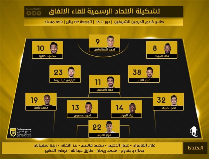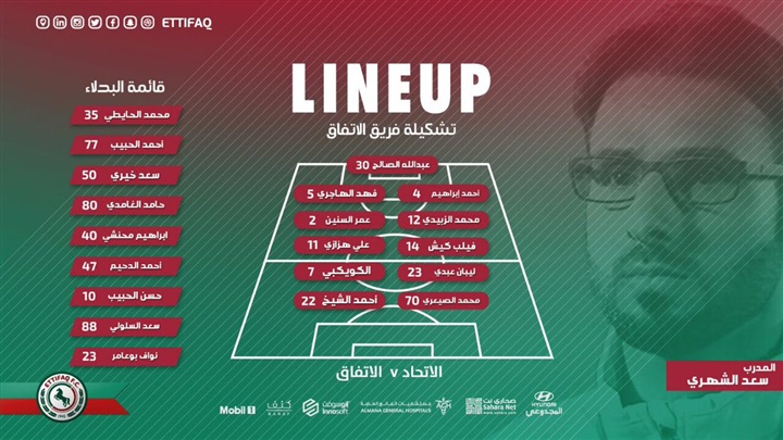 لفريق الاتفاق السعودي، خلال المباراة التى تجمعه بعد قليل أمام اتحاد جدة بقيادة المصري