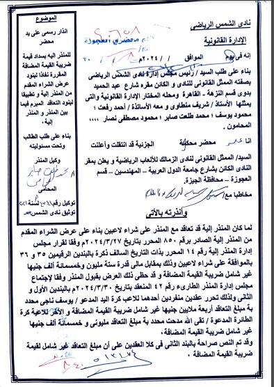 وإزاء عدم التزام مجلس الزمالك بالبند الثانى فى كلا العقدين والذى يؤكد صراحة أن مبلغ التعاقد غير شامل القيمة الماضة قام مسئولو الشمس بإنذار مجلس الزمالك بضرورة سداد القيمة المضافة خلال 10 يوما من موعد تسلم الإنذار والا سيتم المطالبة بتطبيق البندين الخامس والثامن من بنود التعاقد التى تضمن حقوق نادي الشمس وفقا لنصوص القانون.