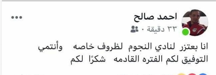 وكتب "صالح" عبر حسابه الشخصي على موقع التواصل الاجتماعي "فيس بوك":"أنا بعتذر لنادي النجوم لظروف خاصة وأتمنى التوفيق لكم الفترة القادمة شكرًا لكم".