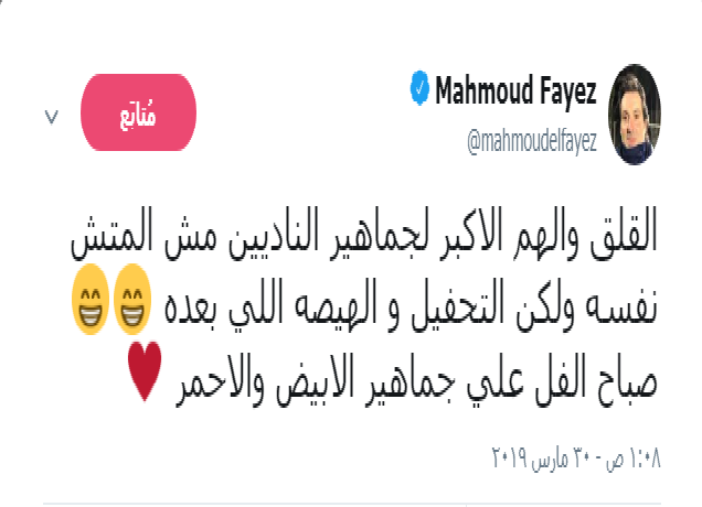 وكتب فايز عبر صفحته الشخصية علي موقع التواصل الإجتماعي "تويتر" : "القلق والهم الأكبر لجماهير الناديين مش الماتش نفسه ولكن التحفيل و الهيصه اللي بعده ، صباح الفل علي جماهير الابيض والاحمر ".