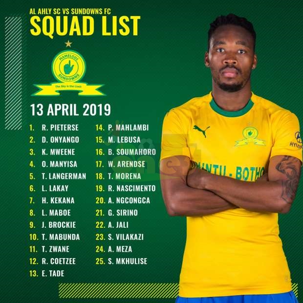 أعلن بيتسو موسيماني المدير الفني لفريق صن داونز الجنوب أفريقي، عن قائمة فريقه لمواجهة النادي الأهلي المصري في إياب ربع نهائي دوري أبطال أفريقيا.