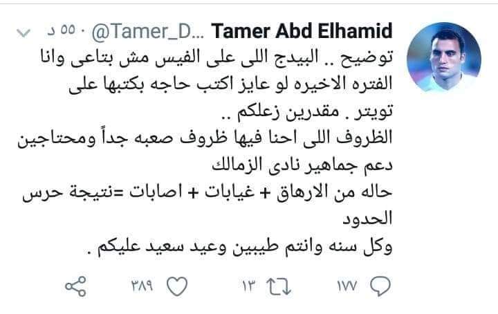 وقال تامر عبد الحميد عبر صفحته الرسمية على تويتر، إنه يُقدر حزن الجماهير ولكن الظروف التي يمر بها النادي صعبة، والفريق يحتاج الدعم الفترة المقبلة.