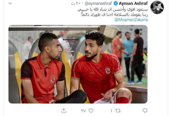 قدم أيمن أشرف، مدافع الفريق الأول، لكرة القدم بالنادي الأهلي، دعمه لمؤمن زكريا جناح المارد الأحمر والذي يعاني من الإصابة على مستوى الجهاز العصبي.