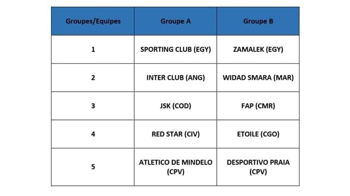 فيما ضمت المجموعة الأولى كلًا من "سبورتنج السكندري - انتر كلوب الأنجولي - JSK الكونغولي - ريد ستار الإيفواري - أتليتكو مينديلو من الرأس الأخضر".