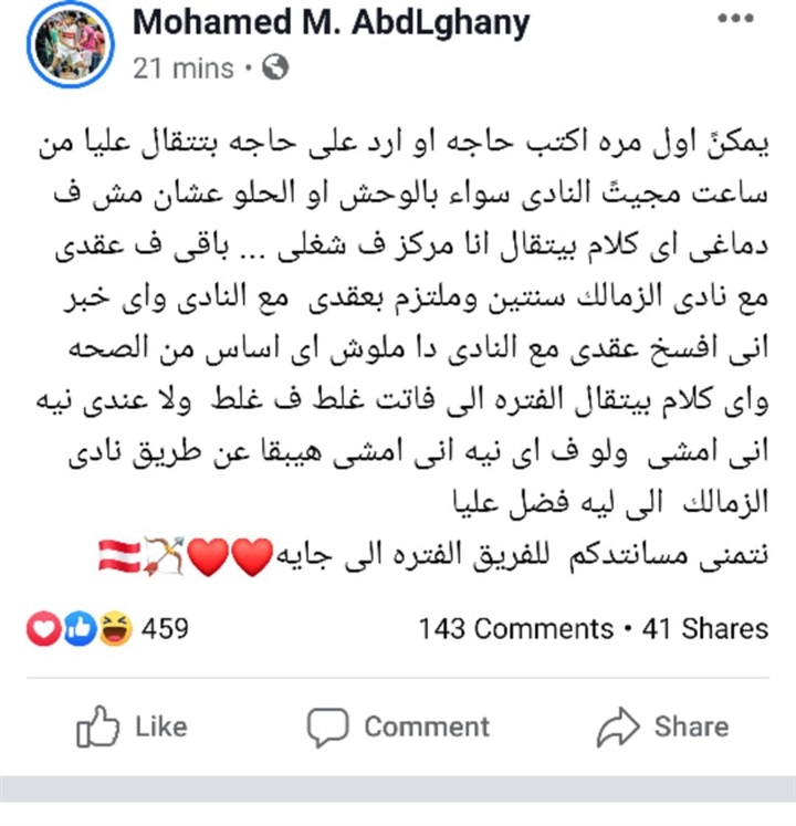 وقال عبد الغني، على صفحته الشخصية عبر موقع التواصل الاجتماعي "فيس بوك" : يمكنً اول مره اكتب حاجه او ارد على حاجه بتتقال عليا من ساعت مجيتً النادى سواء بالوحش او الحلو، عشان مش ف دماغى اى كلام بيتقال انا مركز ف شغلى ... باقى ف عقدى مع نادى الزمالك سنتين وملتزم بعقدى مع النادى واى خبر انى افسخ عقدى مع النادى دا ملوش اى اساس من الصحه واى كلام بيتقال الفتره الى فاتت غلط ف غلط ولا عندى نيه انى امشى ولو ف اى نيه انى امشى هيبقا عن طريق نادى الزمالك الى ليه فضل عليا..نتمنى مسانتدكم للفريق الفتره المقبلة".