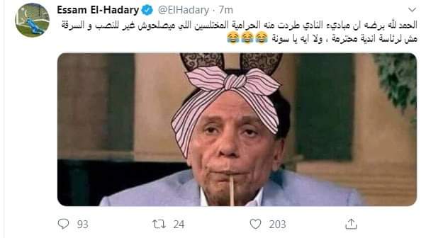ونشر الحضري على حسابه عبر تويتر، قائلا " الحمد لله برضه إن مباديء النادي طردت منه الحرامية المختلسين اللي ميصلحوش غير للنصب والسرقة مش لرئاسة أندية محترمة، ولا إيه يا سونة".