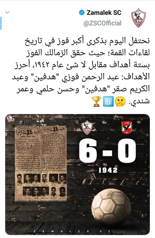 احتفلت الصفحة الرسمية لنادي الزمالك على موقع التواصل الاجتماعي تويتر بذكرى الفوز على غريمه التقليدي الأهلي بستة أهداف دون رد، كأكبر نتيجة في تاريخ مواجهات الفريقين