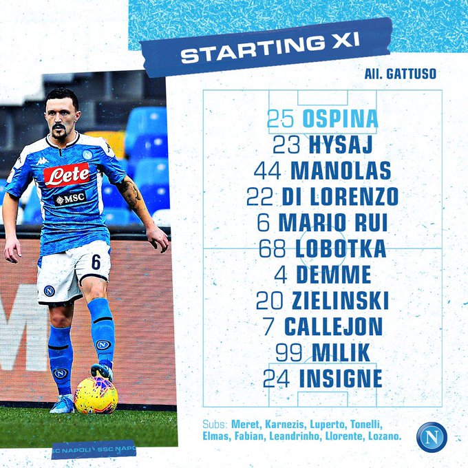 أعلن الإيطالى جينارو جاتوزو المدير الفنى لنابولى عن تشكيلة فريقه لمواجهة لاتسيو في اللقاء الذي يقام على ملعب سان باولو ضمن منافسات الدور ربع النهائي من بطولة كأس إيطاليا.