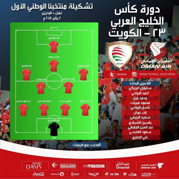 أعلن بيم فيربيك، المدير الفني لمنتخب عمان، تشكيلة فريقه لمواجهة البحرين، في نصف نهائي خليجي 23 المقام بالكويت.
