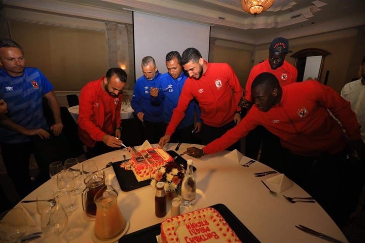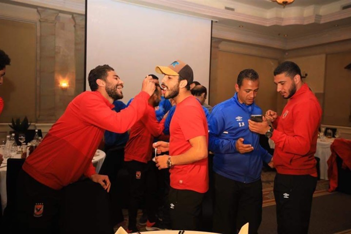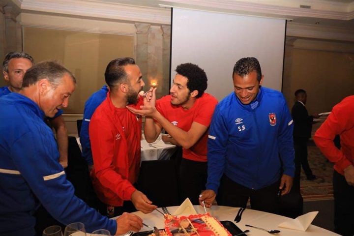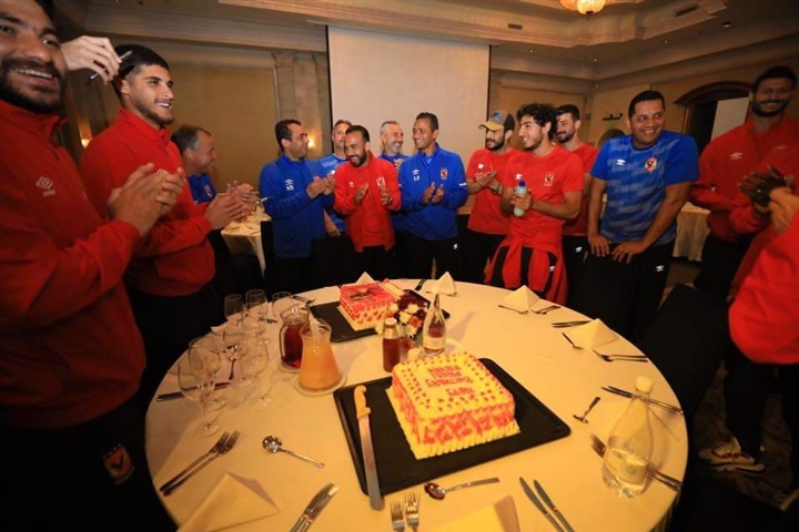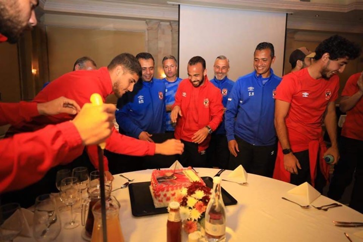 لاعبو الأهلي والجهاز الفني يحتفلون بعيد ميلاد قمصان وأفشة