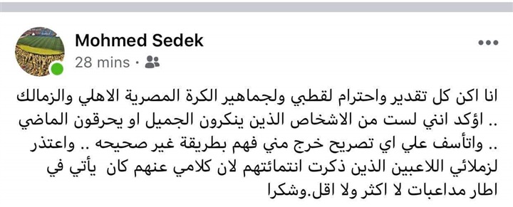 وكتب محمد صديق عبر حسابه الرسمي على موقع التواصل الاجتماعي "فيس بوك":" انا اكن كل تقدير واحترام لقطبي ولجماهير الكرة المصرية الأهلي والزمالك.