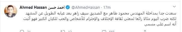 وكتب أحمد حسن عبر صفحته الرسمية بموقع التواصل الاجتماعي "تويتر": "سعدت جدًا بمداخلة المهندس محمود طاهر مع الصديق سيف زاهر، بعد غيابه الطويل عن المشهد الرياضي".