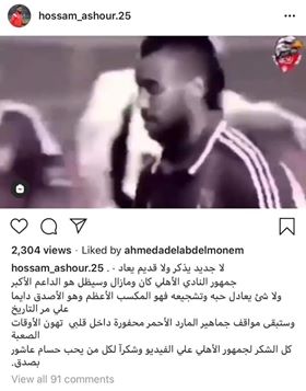 ونشر حسام عاشور فيديو الجماهير عبر صفحته الرسمية بموقع التواصل الاجتماعي "انستجرام" قائلًا: "لا جديد يذكر ولا قديم يعاد جمهور النادي الأهلي كان ومازال وسيظل هو الداعم الأكبر ولا شئ يعادل حبه وتشجيعه فهو المكسب الأعظم وهو الأصدق دائما على مر التاريخ".