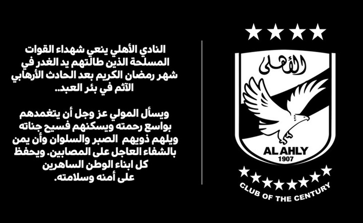 النادي الأهلي ينعي شهداء القوات المسلحة الذين طالتهم يد الغدر في شهر رمضان الكريم بعد الحادث الأرهابي الآثم في بئر العبد ".