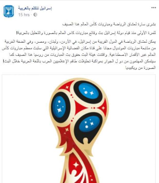 أعلنت صفحة «إسرائيل بالعربية» على موقع التواصل الاجتماعي «فيسبوك» قيام ن إسرائيل ببث منافسات كأس العالم، مجانا على قناة مكان الفضائية، وباللغة العربية.