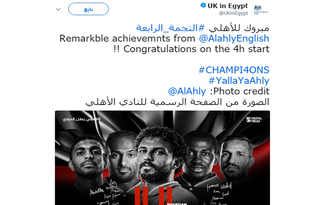 قامت السفارة الإنجليزية بالقاهرة بتقديم التهنئة للنادي الأهلي بعد فوز الفريق الأول لكرة القدم بلقب بطولة الدوري.