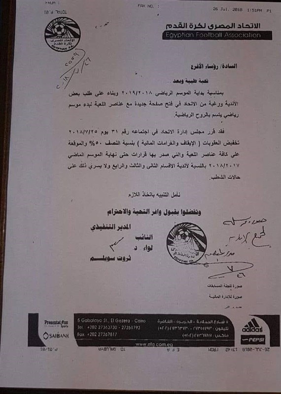 وأكد ألفاكس الذى أرسله اتحاد الكرة للأندية أن القرار يأتى كخطوة من اتحاد الكرة لفتح صفحة جديدة مع كل الأندية وذلك فى بداية الموسم الجديد الذى تمنى اتحاد الكرة أن يتسم بالروح الرياضية بين جميع الأندية فى كل الألعاب.