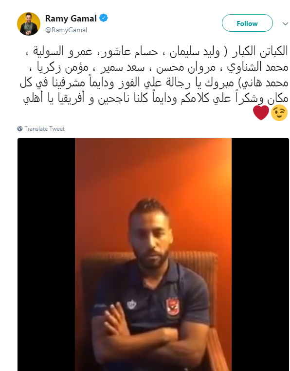 حرص المطرب رامي جمال، على تهنئة لاعبي الفريق الأول لكرة القدم بالنادي الأهلي، بعد تحقيق الفوز على نظيره تاونشيب البتسواني، بهدف دون رد في المباراة التي جمعتهما اليوم السبت، ضمن منافسات الجولة الرابعة من دور المجموعات بدوري أبطال إفريقيا.