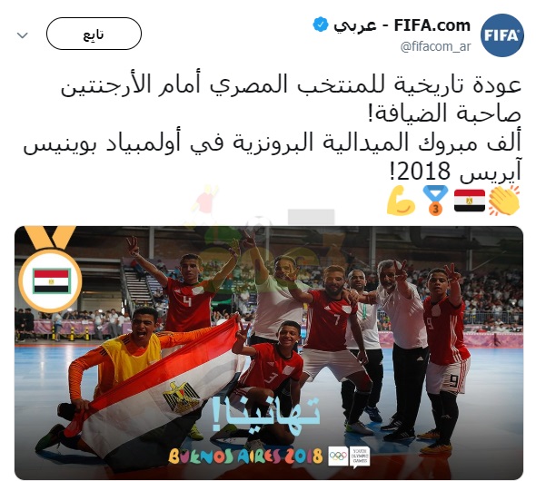 حرص الاتحاد الدولى لكرة القدم "فيفا"، على تهنأة المنتخب المصرى لكرة الصالات، بعد انجازه التاريخى بالحصول على الميدالية البرونزية فى أولمبياد الشباب الأرجنتين، عقب الفوز على صاحب الأرض والجمهور 5-4.